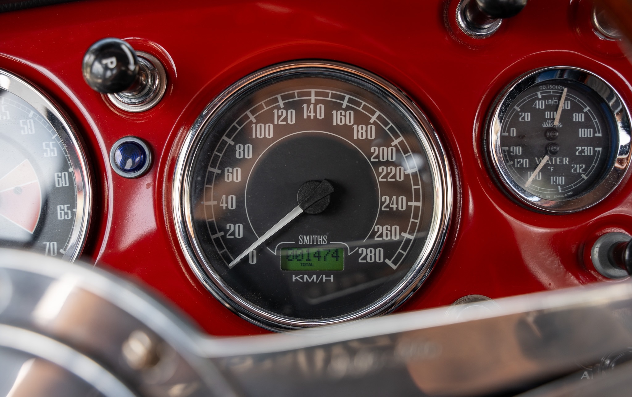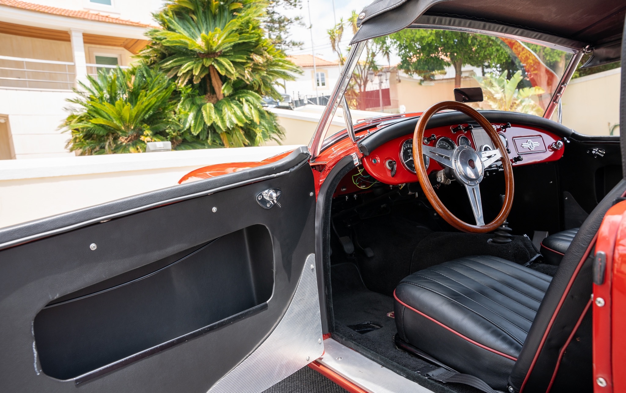 Por dentro? Volante em madeira, bancos em pele de cor preto em contraste com vivo vermelho e, um painel que parece ter sido desenhado a régua e compasso por um engenheiro da Royal Air Force.